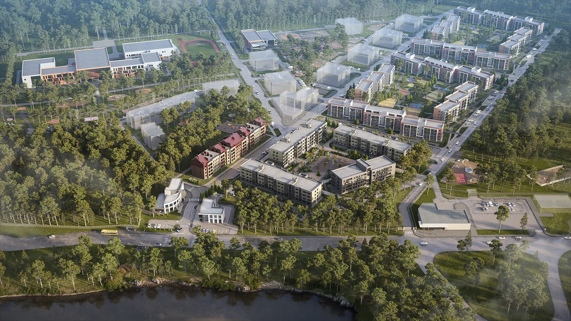 Бережно сохранённый сосновый массив превратится в настоящий городской лес. На его территории планируется создать экотропы для прогулок, канатные городки для детей и уютные локации для отдыха на свежем воздухе